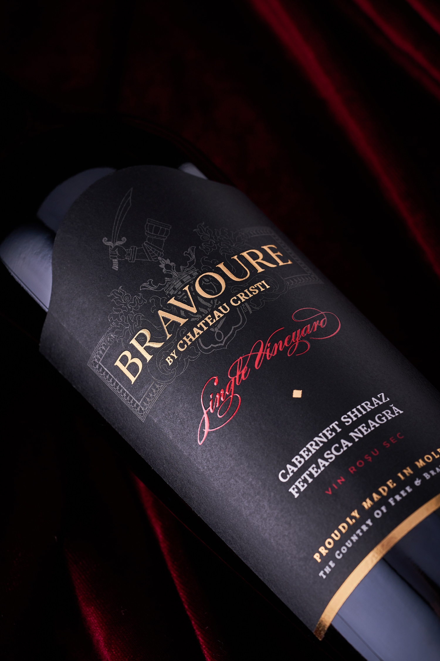 The work of our studio consists of both creating brands “from scratch”, and updating existing brands that need to be updated in line with the trends of today's market. The redesign of the label for the Bravoure blended wines from Chateau Cristi winery is a good example of the second type of projects. Having created the initial design based on the existing branding of the company, we were faced with the need to redesign the label for a new bottle chosen by the manufacturer for new wines in this collection. This was the beginning of the redesign project for Bravoure wines.