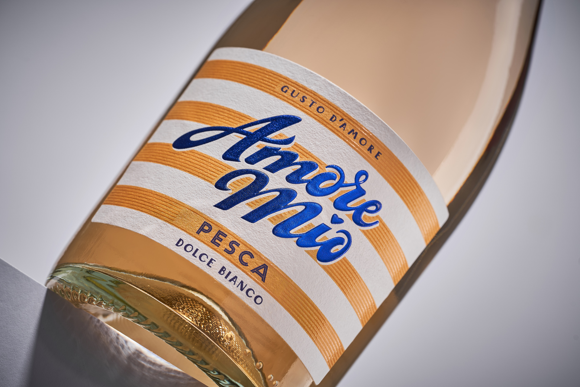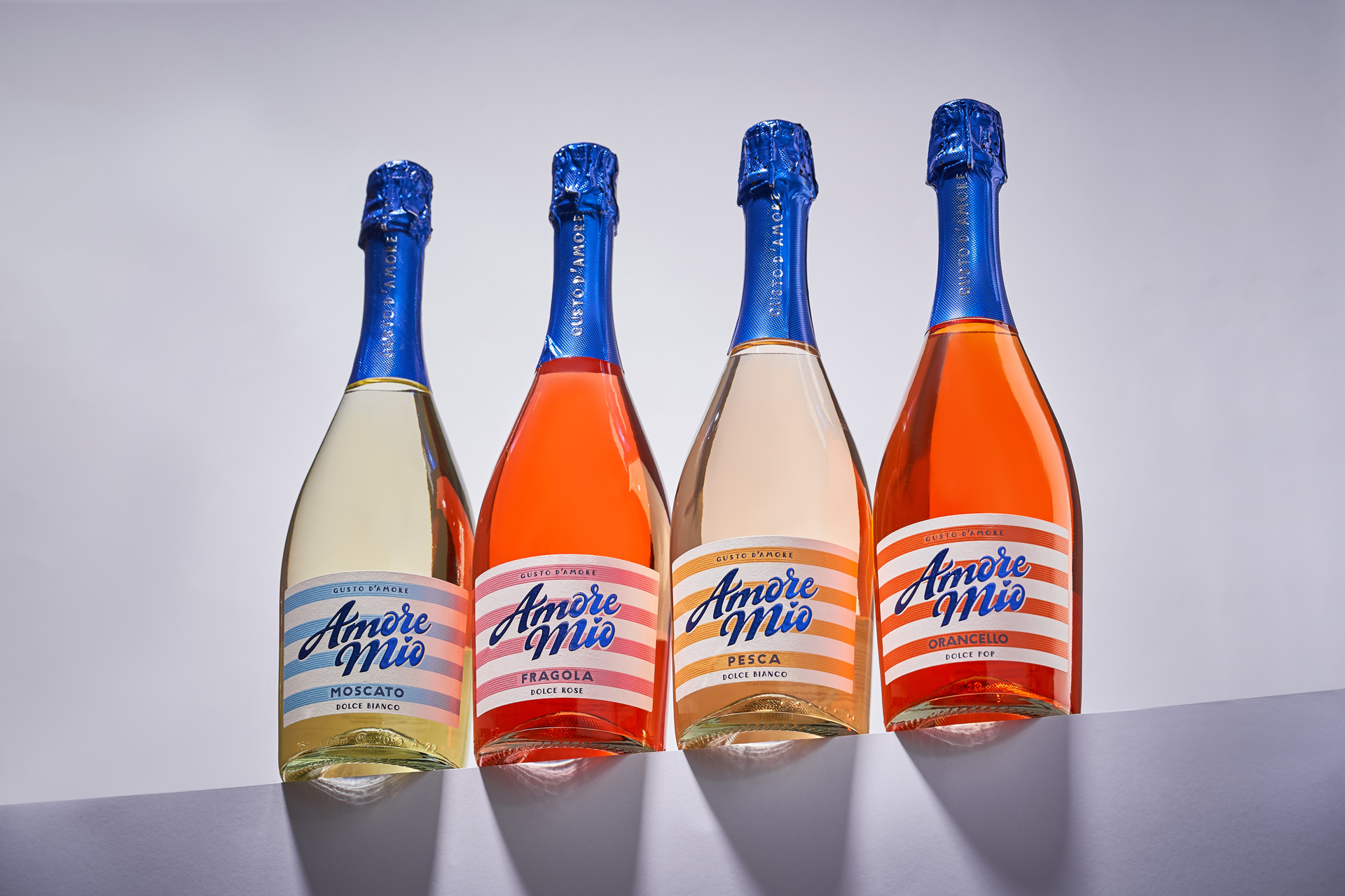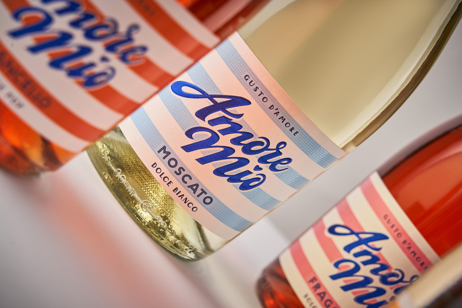 Amore Mio - линейка ready-to-drink коктейлей на основе вина, ориентированная на эмоциональное и импульсное потребление. Перед студией стояла задача создать образ, ассоциирующийся с летом и dolce vita, сохранив ощущение доступности без визуальной «дешёвизны». Дизайн должен был быстро считываться с полки, передавать характер вкусов и формировать цельную серию. Важно было найти баланс между лёгкостью, привлекательностью и аккуратной, современной подачей.