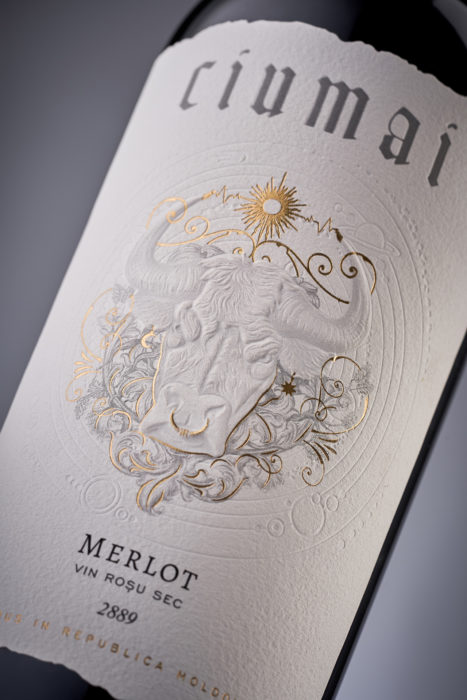 Студия 43oz разработала визуальную концепцию, в основе которой — стилизованная голова буйвола, отсылающая к молдавскому гербу и символизирующая прочную связь вина с его происхождением. Вокруг неё выстроена композиция из эзотерических элементов, подчеркивающих таинство ремесла и исключительность каждого выпуска. Богатый тактильный опыт создают сразу несколько производственных техник: объёмное 3D клише, деликатный дебоссинг и золотое тиснение. Итоговая этикетка не только визуально рассказывает о вине, но и ощущается как предмет роскоши, достойный своей категории.